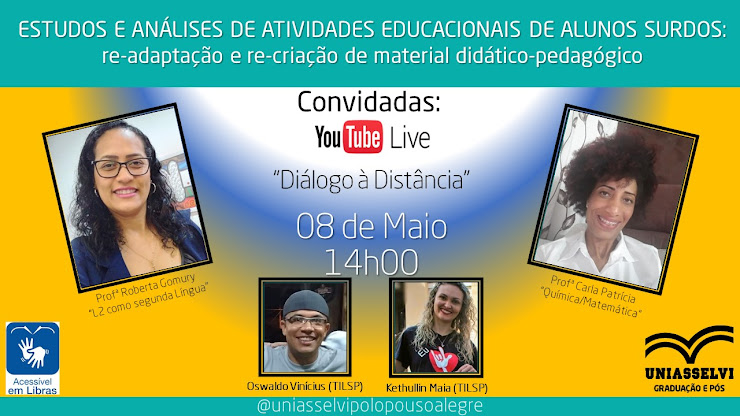 A Uniasselvi, Polo Pouso Alegre-MG, apresenta a próxima Live, a primeira de 2021 do Projeto Diálogos à Distância - "ESTUDOS E ANÁLISES DE ATIVIDADES EDUCACIONAIS DE ALUNOS SURDOS: re-adaptação e re-criação de material didático-pedagógico"